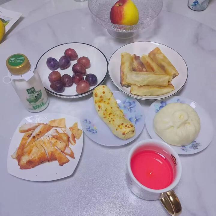 “比如最近一天的早餐,有鸡胸肉、牛肉卷、春卷、包子、水果、牛奶和运动饮料,孩子基本能吃个8、9成。另外,我们从来不让孩子在路上急急忙忙地吃早饭,都会让他在家里吃落胃了再出门。”